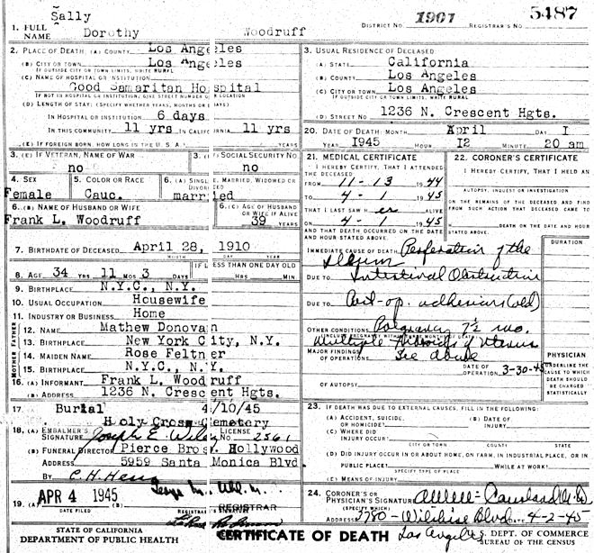 Parents Father: DONOVAN, Matthew John Mother: FELTNER, Rosamund Birth Born on April 28, 1910 in New York, NY Death Died on April 01, 1945 in Los Angeles, Los Angeles Co., CA Buried in Holy Cross Cemetery in Culver City, Los Angeles Co., CA Marriages WOODRUFF, Frank Lee Married on 1932 in New York, NY Notes Death: Perforation of the Ileum/ Intestinal Obstruction Sources California Deaths: Los Angeles Co. Los Angeles Vol 468 #5487 Images Dorothy (Donovan) Woodruff Death