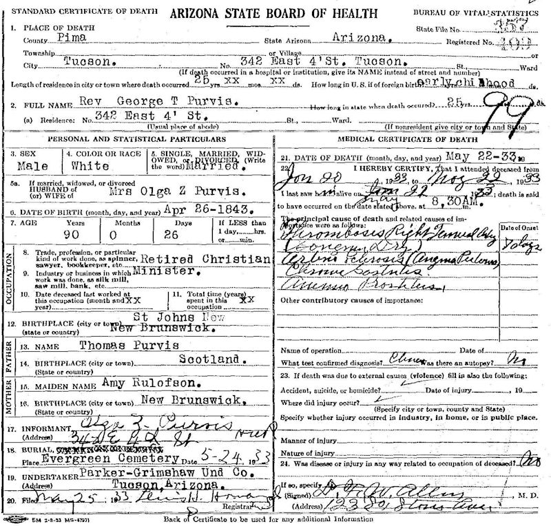 Parents Father: PURVES, Thomas Mother: RULOFSON, Amy Caroline Birth Born on April 26, 1843 in Hampton, Kings Co., NB Death Died on May 22, 1933 in Tucson, Pima Co., AZ Buried in Evergreen Memorial Park in Tucson, Pima Co., AZ Marriages HOWE, Olga (Zalle) Married on August 30, 1913 in Tucson, Pima Co., AZ Notes Occupation: Clergyman - First Christian Church Death: Arterial Thrombosis Sources Arizona Deaths: #357 Images George Purvis George Purvis Death George Purves Marriage