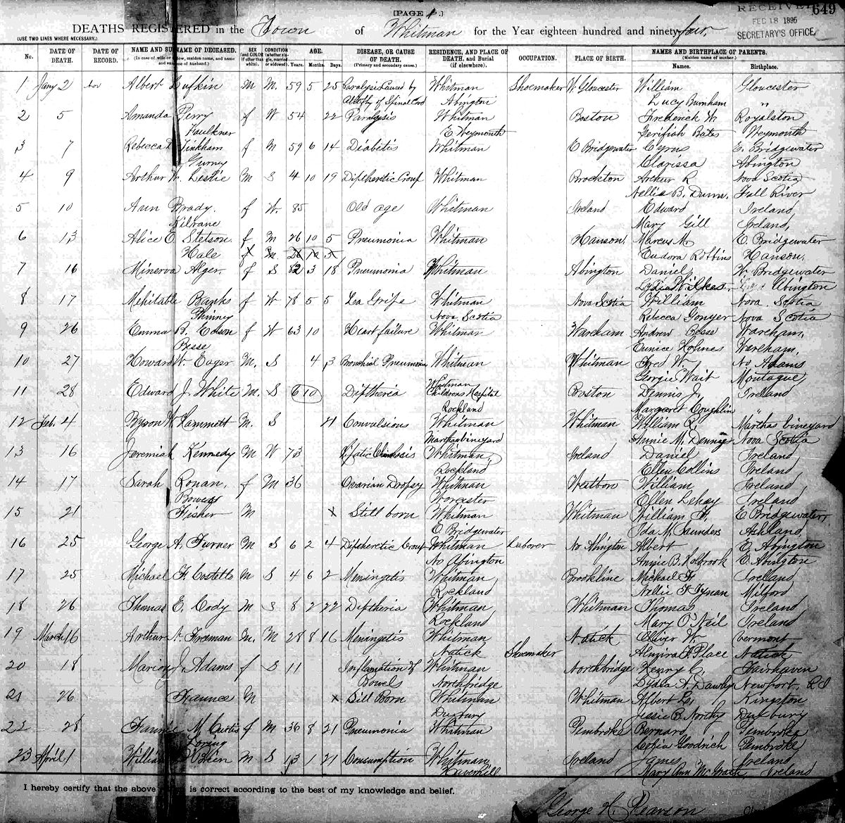 Parents Father: PHINNEY, William Mother: STARRATT, Rebecca (Goucher) Birth Born on August 12, 1815 in Wilmot, Annapolis Co., NS Death Died on January 17, 1894 in Whitman, Plymouth Co., MA Buried in Fundy View Cemetery in Port Lorne, Annapolis Co., NS Marriages BANKS, Joseph Children BANKS, Exaline R.: October 21, 1849 - November 11, 1932 BANKS, Leonora: 1851 - 1853 BANKS, Laleah A.: May 11, 1853 - May 05, 1898 BANKS, Elizabeth L.: 1856 - 1933 BANKS, Mary Ann: September 17, 1857 - April 10, 1918 Notes Death: La Gripe Sources Massachusetts Deaths: Whitman,MA Pg. 649 #8 Images Mehitable (Phinney) Banks Mehitable (Phinney) Banks Death