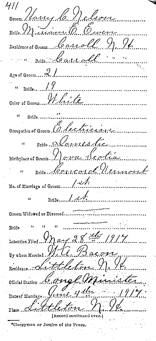 Birth Born on April 27, 1898 in Waterford, Caledonia Co., Vt Death Died on June 01, 1989 in Portsmouth, Rockingham Co., NH Buried in Johns River Cemetery in Dalton, Coos Co., NH Marriages NELSON, Harry Cummings Married on June 04, 1917 in Littleton, Grafton Co., NH Children NELSON, Wesley E.: November 16, 1922 - 1984 NELSON, Roger L.: October 18, 1925 - September 26, 2008 NELSON, Duane Remick: July 02, 1927 - May 20, 2011 NELSON, Eugene M.: September 04, 1930 - May 17, 1958 NELSON, Conrad G.: March 12, 1932 - March 15, 2013 Images Miriam Ewen Birth Miriam (Ewen) Nelson Harry Nelson Marriage