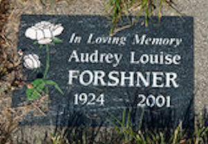 Birth Born on 1924 Death Died on 2001 in British Columbia, Canada Buried in Maple Ridge Cemetery in Maple Ridge, Metro Vancouver Region, BC Marriages FORSHNER, Wilbur Raymond Children FORSHNER, Maureen FORSHNER, Joy FORSHNER, Harley FORSHNER, Scott Sources Cemetery: Maple Ridge Cemetery Maple Ridge,BC Images Audrey (Chic) Forshner