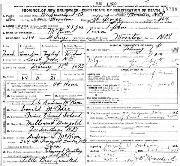 Birth Born on February 11, 1873 in Saint John, Saint John Co., NB Death Died on February 01, 1938 in Moncton, Westmorland Co., NB Buried in Elmwood Cemetery in Moncton, Westmorland Co., NB Marriages McKIM, Andrew Married on November 19, 1894 in Moncton, Westmorland Co., NB Children McKIM, Beulah Maybelle: September 17, 1895 McKIM, Andrew: 1898 - 1899 McKIM, Mildred: 1900 - 1908 McKIM, Veronica: November 09, 1902 - 1934 McKIM, Bernice Algertha: February 11, 1905 - 1979 McKIM, Andrew Theodore Paul: November 09, 1908 - May 07, 1971 Notes Death: Cancer of Brain - Cancer of Breast Sources NB Deaths: #15799 Images Andrew & Laura (McPhee) & Andrew,Mildred & Veronica McKim Laura (McPhee) McKim Death Andrew McKim Marriage2