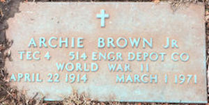 Parents Father: BROWN, Archibald Mother: BLAND, Elizabeth J. Birth Born on April 22, 1914 in Brockton, Plymouth Co., MA Death Died on March 01, 1971 in Boston, Suffolk Co., MA Buried in Melrose Cemetery in Brockton, Plymouth Co., MA Marriages McAFEE, Mildred Elizabeth Notes Military Service: WW2 US Army Occupation: Bookkeeper Sources Massachusetts Deaths: #012407 Images Archibald Bown Birth Archibald & Mildred (McAfee) Brown Jr Archibald Brown Jr1
