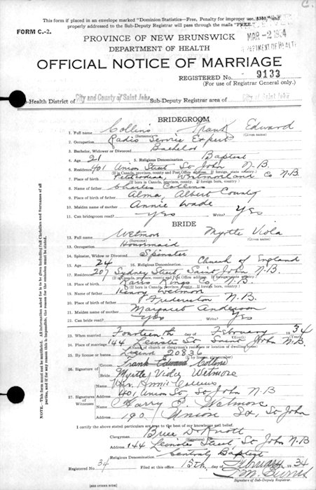 Birth Born on July 31, 1909 in Kars, Kings Co., NB Marriages COLLINS, Frank Edward Married on February 14, 1934 in Saint John, Saint John Co., NB Notes Occupation: Maid Images Myrtle Wetmore Birth Frank Collins Marriage
