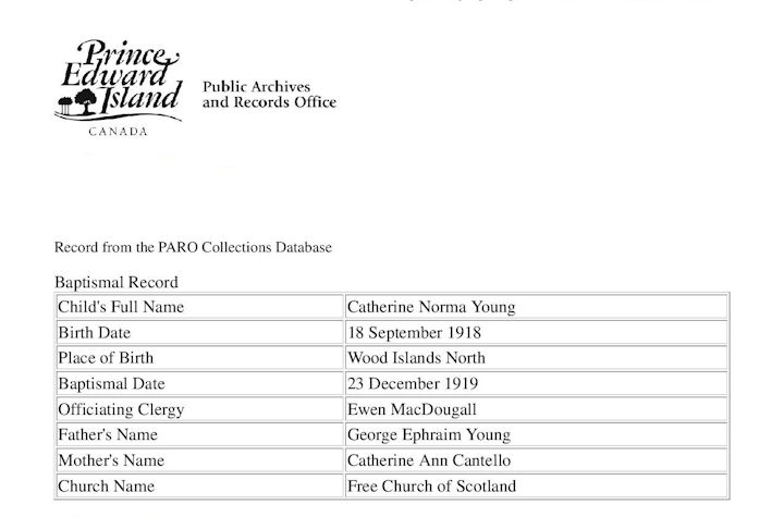 Parents Father: YOUNG, George Ephraim Mother: CANTELLO, Catherine Anne Birth Born on September 18, 1918 in Wood Islands, Queens Co., PE Images Catherine N. Young Birth