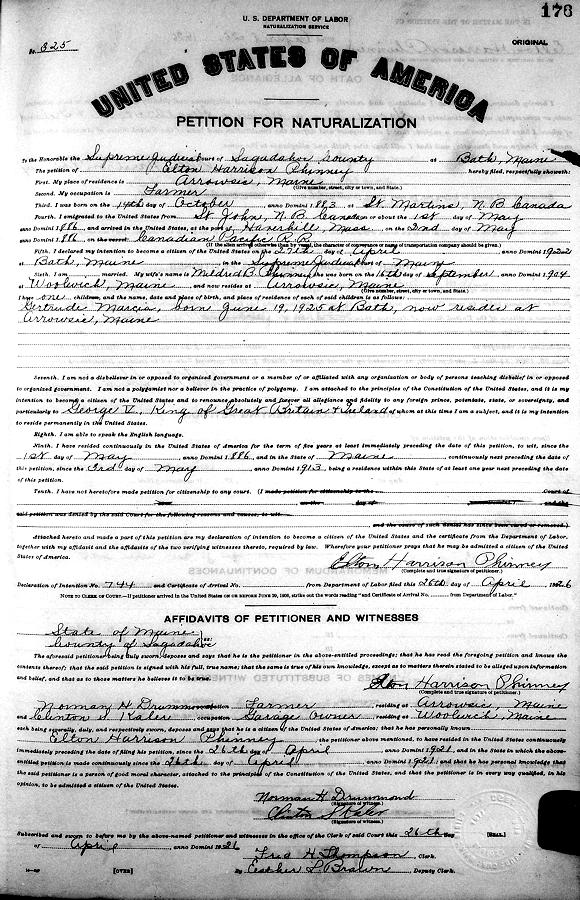 Parents Father: PHINNEY, Robert Peel Mother: CAIN, Lydia Ann Birth Born on October 14, 1883 in St. Martin's, Saint John Co., NB Death Died on 1952 in Bath, Sagadahoc Co., ME Buried in Oak Grove Cemetery in Bath, Sagadahoc Co., ME Marriages KENNERSON, Mildred B. Married on October 14, 1922 in Arrowsic, Sagadahoc Co., ME Children PHINNEY, Gertrude Marcia: June 19, 1925 - March 27, 2009 Notes Occupation: Reamer - Texas Steamship Co./ Farmer Sources Findagrave.com: http://www.findagrave.com/cgi-bin/fg.cgi?page=gr&GSln=Phinney&GSiman=1&GScnty=1222&GRid=147063307& Images Elton Phinney Elton Phinney WW1 Draft Elton Phinney Naturalization