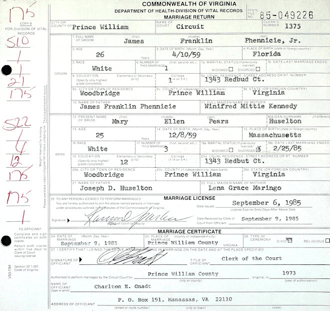Birth Born on December 08, 1959 in Massachusetts, USA Marriages PHENNICIE, James Franklin Married on September 09, 1985 in Woodbridge, Prince William Co., VA Images James F. Phennicie Jr Marriage