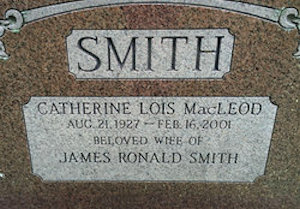 Birth Born on August 21, 1927 in Fort Frances, Rainy River District, ON Death Died on February 16, 2001 in Cornwall, Stormont, Dundas & Glengarry Co., ON Buried in Holy Trinity Anglican Cemetery in Lakefield, Argenteuil Regional Co., QC Marriages SMITH, James Ronald Sources Mormons: https://familysearch.org/ark:/61903/2:2:3V5D-FFQ Images Catherine (MacLeod) Smith