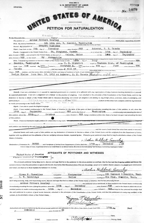 Parents Father: GOURLEY, Albert James Mother: CHAPMAN, Bessie Maud Birth Born on November 05, 1883 in Amherst, Cumberland Co., NS Death Died on January 21, 1955 in Santa Barbara, Santa Barbara Co., CA Buried in Santa Barbara Cemetery in Santa Barbara, Santa Barbara Co., CA Marriages SMITH, Gertrude Margaret Married on June 02, 1909 in Parrsboro, Cumberland Co., NS Children GOURLEY, Evelyn Elaine: March 18, 1910 - March 18, 1993 Notes Occupation: Retail Salesman Images Arthur Gourley WW2 Draft Arthur Gourley Marriage Arthur Gourley Naturalization