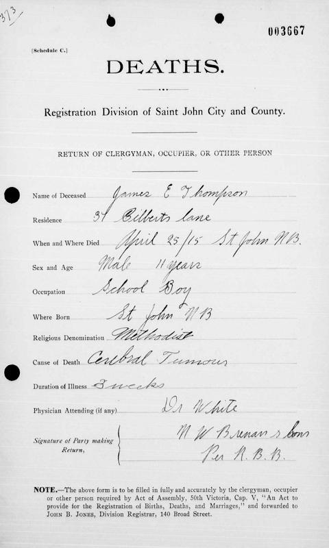 Parents Father: THOMPSON, James Samuel Mother: McCOLLOM, Ann Bell Birth Born on December 08, 1903 in Saint John, Saint John Co., NB Death Died on April 25, 1915 in Saint John, Saint John Co., NB Buried in Wesleyan Burial Ground in Saint John, Saint John Co., NB Notes Death: Cerebral Tumor Sources NB Deaths: #3667 Images James E. Thompson Birth James E. Thompson Death
