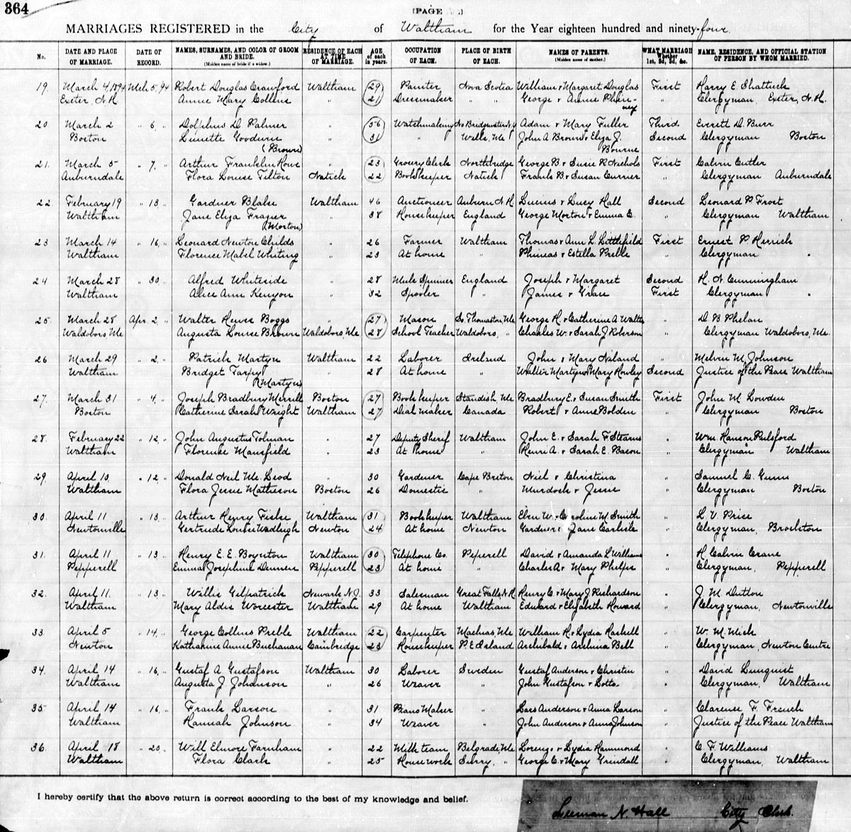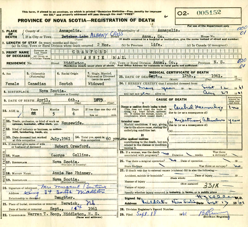 Parents Father: COLLINS, George Otis Mother: PHINNEY, Anna May Birth Born on April 06, 1873 in Nova Scotia, Canada Death Died on September 12, 1961 in Berwick, Kings Co., NS Buried in Berwick Cemetery in Berwick, Kings Co., NS Marriages CRAWFORD, Robert Douglas Married on March 04, 1894 in Exeter, Rockingham Co., NH Children CRAWFORD, Annie Mae: June 08, 1895 - January 10, 1988 CRAWFORD, Margaret Sangster: November 08, 1896 - November 26, 1990 CRAWFORD, William Harold: April 08, 1898 CRAWFORD, Robert Leander: April 23, 1900 - May 08, 1979 CRAWFORD, Muriel Constance: October 03, 1903 - May 21, 1997 CRAWFORD, George Otis: December 30, 1906 - April 23, 1991 CRAWFORD, Charles Phinney: November 06, 1908 - July 24, 1980 CRAWFORD, Austin Leroy: March 15, 1911 - October 19, 1987 CRAWFORD, Burton Lorimer: June 17, 1916 - May 20, 1925 Notes Death: Cerebral Hemorhage Occupation: Dressmaker Sources Nova Scotia Deaths: Year 1961 #5152 Images Annie (Collins) Crawford Death Annie Collins Marriage Annie Collins