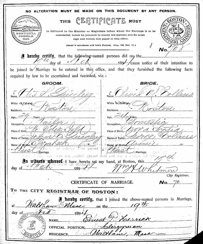 Birth Born on November 13, 1864 in North Tryon, Prince Co., PE Death Died on July 18, 1946 in Clarcona, Orange Co., FL Buried in Greenwood Cemetery in Orlando, Orange Co., FL Marriages COLLINS, Olivia Margaret Married on February 19, 1894 in Waltham, Middlesex Co., MA Children QUIGLEY, George Otis: February 09, 1895 - November 12, 1959 QUIGLEY, Elmer Dolliver: July 15, 1908 QUIGLEY, Willard Eustis: June 08, 1910 - January 11, 1945 Notes Occupation: Tailor/ Owner of Citrus Grove Sources Findagrave.com: https://www.findagrave.com/memorial/69902627/otis-lemuel-quigley Images Otis & Olivia (Collins) Quigley Olivia Collins Marriage Otis Quigley Naturalization