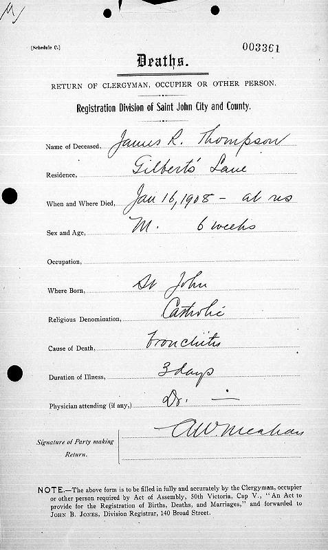 Parents Father: THOMPSON, James Samuel Mother: McCOLLOM, Ann Bell Birth Born on 1907 in Saint John, Saint John Co., NB Death Died on January 16, 1908 in Saint John, Saint John Co., NB Notes Death: Bronchitis Sources NB Deaths: #3361 Images James R. Thompson Death