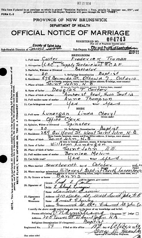 Parents Father: CARTER, Douglas Truman Mother: THOMPSON, Annie Bell Helen Birth Born on 1944 in Saint John, Saint John Co., NB Marriages LUNERGAN, Linda Cheryl Married on October 17, 1964 in Lancaster, Saint John Co., NB Notes Occupation: RCAF Supply Technician Images Frederick Carter Marriage