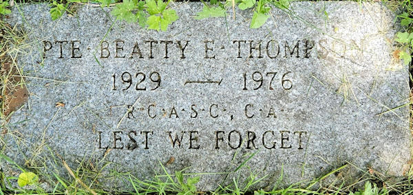 Parents Father: THOMPSON, Ernest Frederick Mother: STEEN, Elizabeth May Birth Born on October 09, 1929 in Saint John, Saint John Co., NB Death Died on 1976 in Saint John, Saint John Co., NB Buried in Cedar Hill Extension Cemetery in Saint John, Saint John Co., NB Marriages WHITE, Ruth Lillian Married on February 04, 1956 in Saint John, Saint John Co., NB Notes Occupation: Stevedore Military Service: RC Army Sources NB Cemeteries: Cedar Hill Extension Cemetery Saint John,NB Images Beatty Thompson Beatty Thompson Marriage