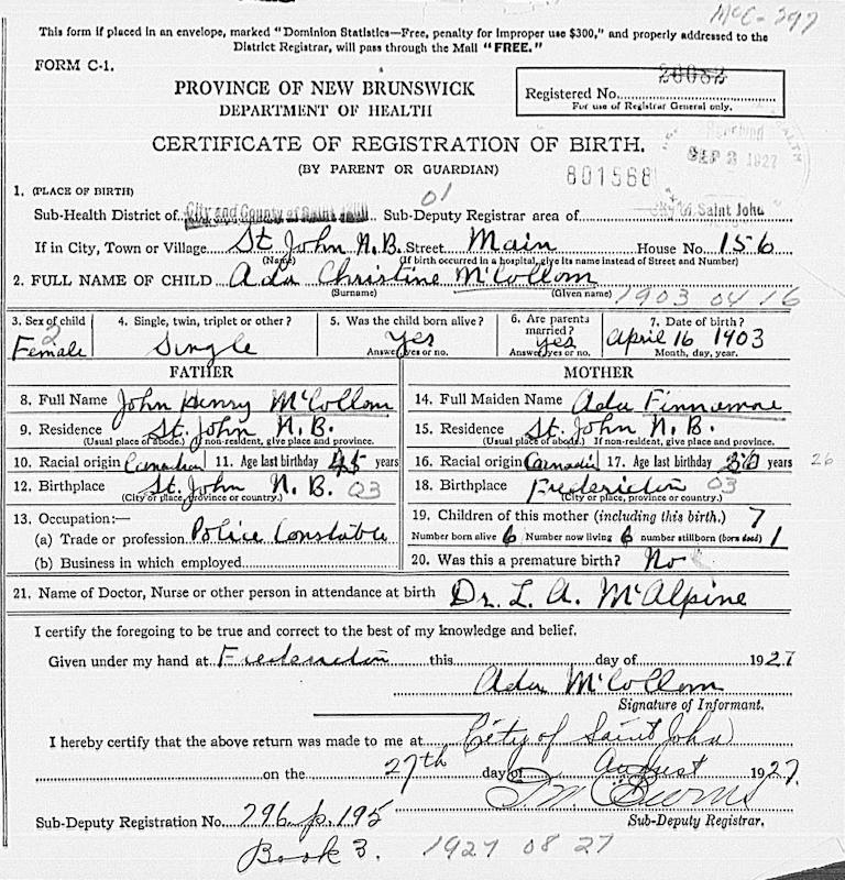 Parents Father: McCOLLUM, John Henry Mother: FINNAMORE, Ada Birth Born on April 16, 1903 in Saint John, Saint John Co., NB Death Died on May 05, 1974 in Massachusetts, USA Buried in Ridgelawn Cemetery in Watertown, Middlesex Co., MA Notes Occupation: Factory Worker Sources Findagrave.com: https://www.findagrave.com/memorial/197720178/ada-mccollom Images Ada McCollom Birth
