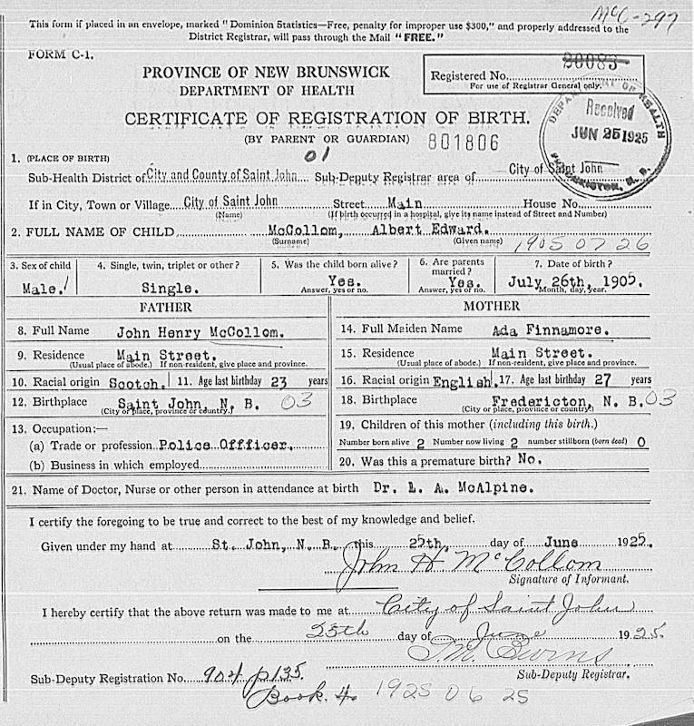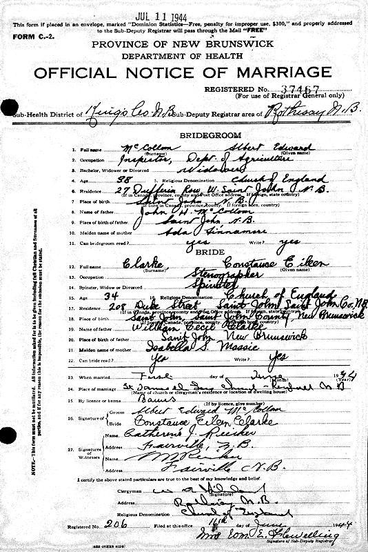Parents Father: McCOLLUM, John Henry Mother: FINNAMORE, Ada Birth Born on July 26, 1905 in Saint John, Saint John Co., NB Death Died on December 26, 1998 in Saint John, Saint John Co., NB Buried in Cedar Hill Cemetery in Saint John, Saint John Co., NB Marriages CLARKE, Constance Eileen Married on June 01, 1944 in Renforth, Kings Co., NB RING, Helen Forrester Married on June 19, 1936 in Saint John, Saint John Co., NB Children McCOLLOM, Helen Forrester: May 14, 1937 - August 13, 2020 Notes Occupation: Investigator Entomological Dept. of Agriculture Sources Mormons: https://www.familysearch.org/en/tree/person/details/GQFH-K32 Images Albert McCollom Birth Albert McCollom Marriage Albert McCollom Marriage2 Constance (Clarke) & Albert McCollom