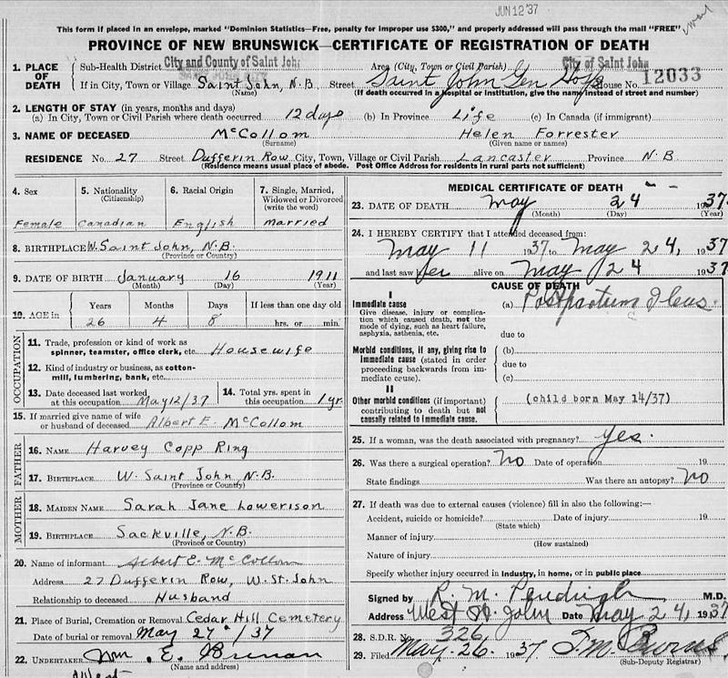 Birth Born on January 16, 1911 in West Saint John, Saint John Co., NB Death Died on May 24, 1937 in Saint John, Saint John Co., NB Buried in Cedar Hill Cemetery in Saint John, Saint John Co., NB Marriages McCOLLOM, Albert Edward Married on June 19, 1936 in Saint John, Saint John Co., NB Children McCOLLOM, Helen Forrester: May 14, 1937 - August 13, 2020 Notes Occupation: Stenographer Death: Postpartum Ileus Sources NB Deaths: #12033 Images Helen (Ring) McCollum Death Albert McCollom Marriage Helen Ring