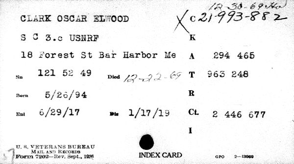 Birth Born on May 26, 1894 in Surry, Hancock Co., ME Death Died on December 22, 1969 in Surry, Hancock Co., ME Buried in Hillside Cemetery in Surry, Hancock Co., ME Marriages EVELETH, Elizabeth Dorothy Married on May 05, 1917 in Bar Harbor, Hancock Co., ME Children CLARK, Hattie Virginia: July 30, 1918 CLARK, Robert Elwood: December 15, 1919 - September 07, 2012 Notes Occupation: Gardener/ Superintendent of a Private Estate Military Service: WW1 US Navy Sources US Veterans Admin Index: SN 1215249 Images Oscar Clark Birth Oscar & Elizabeth (Eveleth) Clark Oscar Clark WW1 Draft Elizabeth Eveleth Marriage1 Elizabeth Eveleth Marriage Oscar Clark Military Service1 Oscar Clark Military Service