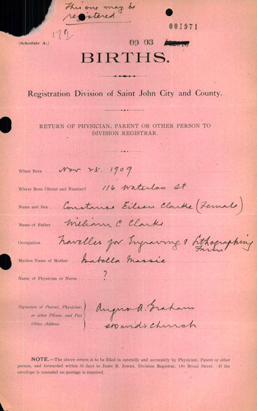 Birth Born on November 25, 1909 in Saint John, Saint John Co., NB Death Died on March 09, 1999 in Saint John, Saint John Co., NB Marriages McCOLLOM, Albert Edward Married on June 01, 1944 in Renforth, Kings Co., NB Notes Occupation: Stenographer Sources Mormons: https://www.familysearch.org/en/tree/person/details/G49R-4HX Images Constance Clarke Birth Albert McCollom Marriage2 Constance (Clarke) & Albert McCollom