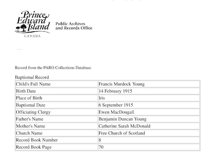 Parents Father: YOUNG, Benjamin Duncan Mother: McDONALD, Katherine Sarah Birth Born on February 14, 1915 in Iris, Queens Co., PE Death Died on 1997 in Kings Co., PE Buried in Murray River Cemetery in Murray River, Kings Co., PE Marriages MACEACHERN, Doris May Children YOUNG, Verlie F.: 1951 Sources Cemetery: Murray River Cemetery Murray River,PEI Images Francis M. Young Birth Francis & Doris (MacEachern) & Verlie Young