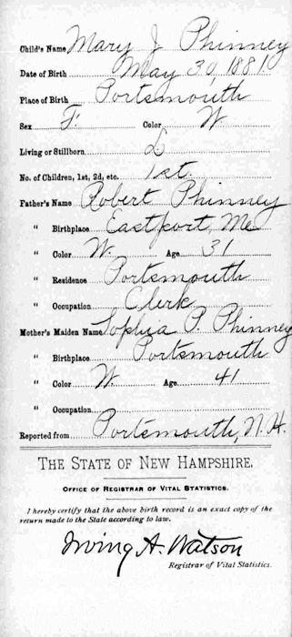 Parents Father: PHINNEY, Robert W. Mother: MOORE, Sophronia J. Birth Born on May 30, 1881 in Portsmouth, Rockingham Co., NH Images Mary J. Phinney Birth