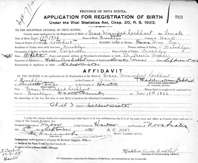 Parents Father: LOCKHART, Francis Augustus Mother: COX, Emma May Birth Born on November 19, 1906 in Brooklyn, Hants Co., NS Death Died on 1988 Buried in Saint Croix Cemetery in Saint Croix, Hants Co., NS Marriages PHILLIPS, Harley Russell Married on August 15, 1928 in Windsor, Hants Co., NS Children PHILLIPS, Girl: December 18, 1932 - December 18, 1932 PHILLIPS, Boy: May 25, 1934 - May 25, 1934 Sources Hants Cemeteries: Saint Croix Cemetery Saint Croix,NS Images Grace Lockhart Birth Harley & Grace (Lockhart) Phillips Grace Lockhart Marriage