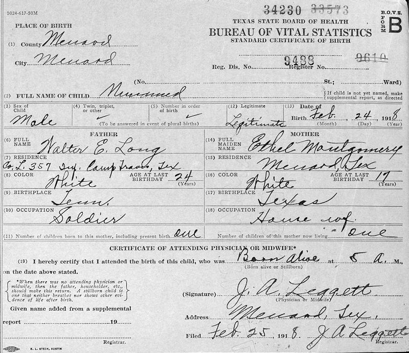 Birth Born on February 24, 1918 in Menard, Menard Co., TX Death Died on July 31, 1987 in Houston, Harris Co., TX Buried in Forest Park East Cemetery in Webster, Harris Co., TX Marriages MARTIN, Zeola Belle Married on September 28, 1940 in Texas, USA Children LONG, La Nette Anna: January 19, 1942 LONG, Monta Eugenia: May 08, 1944 LONG, Martin Montgomery: October 08, 1946 Notes Occupation: Farm worker/ Carpenter Images Everett Long Birth Everett Long WW2 Draft