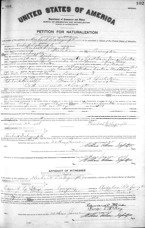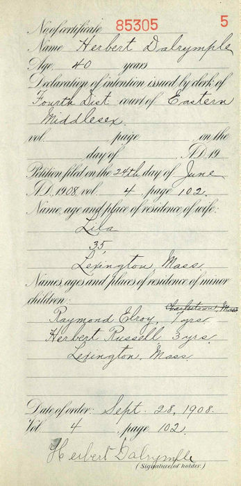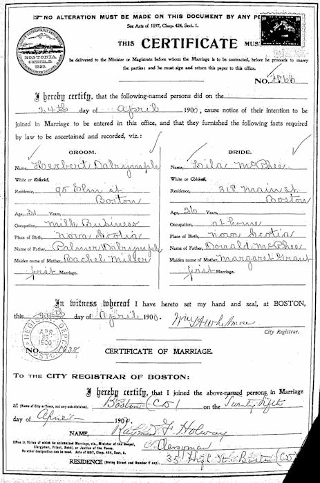 Parents Father: DALRYMPLE, Palmer Mother: MILLER, Rachel Birth Born on November 07, 1868 in Upper Kennetcook, Hants Co., NS Death Died on May 26, 1950 in Lexington, Middlesex Co., MA Buried in Munroe Cemetery in Lexington, Middlesex Co., MA Marriages McPHEE, Lila Adreu Married on April 25, 1900 in Boston, Suffolk Co., MA Children DALRYMPLE, Raymond Elroy: January 09, 1901 - December 08, 1981 DALRYMPLE, Herbert Russell: March 15, 1905 - September 15, 1975 DALRYMPLE, Edward Murray: December 09, 1908 - November 30, 1981 Notes Occupation: Driver of Mill Wagon/ Milk Dealer Sources Mormons: https://www.familysearch.org/tree/person/details/KL7W-NK9 Images Hebert Dalrymple Marriage Herbert Dalrymple Naturalization1 Herbert Dalrymple Naturalization