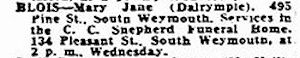 Parents Father: DALRYMPLE, Palmer Mother: MILLER, Rachel Birth Born on May 12, 1886 in East Gore, Hants Co., NS Death Died on April 08, 1957 in Weymouth, Norfolk Co., MA Buried in Mount Hope Cemetery in Weymouth, Norfolk Co., MA Marriages BLOIS, Delbert Leroy Married on March 29, 1904 in Upper Kennetcook, Hants Co., NS Children BLOIS, Reta Mae: May 01, 1904 - December 25, 1999 BLOIS, Eva Janette: April 28, 1905 - March 15, 1972 BLOIS, Rachel: 1906 - February 28, 1907 BLOIS, Robert Elroy: December 23, 1907 - 2005 Sources Findagrave.com: https://www.findagrave.com/memorial/123544329/mary-jane-blois Images Mary J. Dalrymple Marriage Mary (Dalrymple) Blois Obit