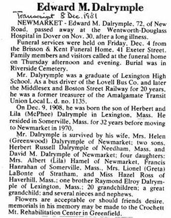 Parents Father: DALRYMPLE, Herbert Mother: McPHEE, Lila Adreu Birth Born on December 09, 1908 in Lexington, Middlesex Co., MA Death Died on November 30, 1981 in Dover, Strafford Co., NH Buried in Riverside Cemetery in Newmarket, Rockingham Co., NH Marriages DEOJAY, Greta Elizabeth Married on 1932 in Somerville, Middlesex Co., MA GREENWOOD, Helen Mabel Children DALRYMPLE, Herbert Russell: May 06, 1933 - April 20, 2012 DALRYMPLE, Lila L.: October 30, 1935 - July 27, 2019 DALRYMPLE, Frances Ann: April 04, 1937 - September 09, 2005 DALRYMPLE, Greta Elizabeth: October 11, 1942 - October 17, 1997 DALRYMPLE, David M.: March 07, 1945 DALRYMPLE, Hazel V.: July 30, 1947 - April 14, 2012 Notes Occupation: Bus Driver Sources Newspaper Obituary: December 8,1981 Images Edward Dalrymple Obit