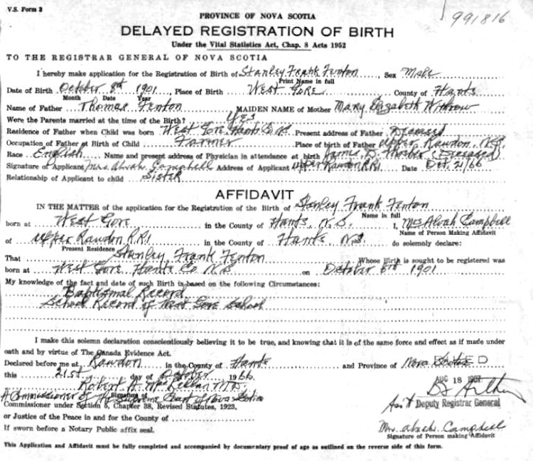 Parents Father: FENTON, Thomas Mother: WITHROW, Mary Elizabeth Birth Born on October 08, 1901 in West Gore, Hants Co., NS Death Died on November 06, 1980 in Detroit, Wayne Co., MI Marriages MACKENZIE, Elsie Pearl Married on September 14, 1929 in Detroit, Wayne Co., MI Children FENTON, Vivian L.: 1932 FENTON, Thomas S.: February 09, 1935 - September 03, 1984 FENTON, Marlene C.: 1937 Notes Occupation: Janitor/ Laundryman - Hospital Sources Michigan Deaths: #61098 Images Stanley Fenton Birth