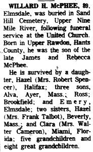 Birth Born on September 29, 1878 in Upper Rawdon, Hants Co., NS Death Died on December 18, 1967 in Halifax, Halifax Regional Municipality, NS Buried in Sand Hill Cemetery in Upper Nine Mile River, Hants Co., NS Marriages DALRYMPLE, Elizabeth Ellen Married on September 04, 1901 in Lexington, Middlesex Co., MA Children MACPHEE, Alva Marsden: August 16, 1903 - August 09, 2000 MACPHEE, Hazel: July 19, 1905 MACPHEE, Ross Willard: August 24, 1913 - December 24, 1984 MACPHEE, Emery Herbert: April 28, 1915 - January 15, 2008 Notes Occupation: Lumberman Death: Cerebral Hemorhage Sources Nova Scotia Deaths: Year 1967 Pg. 7263 Images Elizabeth E. Dalrymple Marriage Willard McPhee Obit