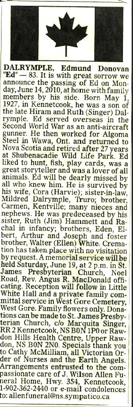 Parents Father: DALRYMPLE, Hiram Blanchard Mother: SINGER, Ruth Electra Birth Born on May 01, 1927 in Kennetcook, Hants Co., NS Death Died on June 14, 2010 in Hants Co., NS Buried in West Gore Cemetery in West Gore, Hants Co., NS Marriages HARVIE, Cora Elizabeth Notes Military Service: WW2 RC Army Obituary: DALRYMPLE, Edmund Donovan 'Ed' '97 83. It is with great sorrow we announce the passing of Ed on Mon-day, June 14, 2010, at home with family members by his side. Born May 1, 1927, in Kennetcook, he was a son of the late Hiram and Ruth (Singer) Dal-rymple. Ed served overseas in the Second World War as an anti-aircraft gunner. He then worked for Algoma Steel in Wawa, Ont. and returned to Nova Scotia and retired after 27 years at Shubenacadie Wild Life Park. Ed liked to hunt, fish, play cards, was a great storyteller and was a lover of all animals. Ed will be dearly missed by all who knew him. He is survived by his wife, Cora (Harvie); sister-in-law, Mildred Dalrymple, Truro; brother, Carmen, Kentville; many nieces and nephews. He was predeceased by his sister, Ruth (Jim) Hammett and Ra-chal in infancy; brothers, Eden, El-bert, Arthur and Joseph and foster brother, Walter (Ellen) White. Crema-tion has taken place with no visitation by request. A memorial service will be held Saturday, June 19, at 2 p.m. in St. James Presbyterian Church, Noel Road, Rev. Angus R. MacDonald offi-cating. Reception will follow in Little White Hall and a private family com-mittal service in West Gore Cemetery, West Gore. Family flowers only. Dona-tions can be made to St. James Presby-terian Church, c/o Marquita Singer, RR 2 Kennetcook, NS B0N 1P0 or Raw-don Hills Health Centre, Upper Raw-don, NS B0N 2N0. Specials thank you to Cathy McMilliam, all Victorian Or-der of Nurses and the Earth Angels. Arrangements entrusted to the com-passionate care of J. Wilson Allen Fu-neral Home, Hwy. 354, Kennetcook, 1-902-362-2440 or e-mail condolences to: allenfuneral@ns.sympatico.ca Occupation: Employee of Algoma Steel/ Employee at Shubenacadie Wild Life Park Sources Funeral Home: J. Wilson Allen Funeral Home Kennetcook,NS Obituary June 2010 Images Edmund & Cora (Harvie) Dalrymple Edmund Dalrymple Obit