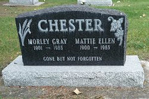 Parents Father: FLEMMING, James Ross Mother: KENT, Bessie Agnes Birth Born on May 15, 1900 in Lower Debert, Colchester Co., NS Death Died on January 09, 1985 in Fort MacLeod, Claresholm Division, AB Buried in Union Cemetery in Fort MacLeod, Claresholm Division, AB Marriages CHESTER, Morley Gray Married on March 26, 1925 in Medicine Hat, Cypress District., AB Children CHESTER, Valena CHESTER, Elizabeth Kaye: January 24, 1937 - May 20, 2014 Notes Obituary: Lethbridge Herald January 10, 1985 CHESTER Passed away on Wednesday, January 9th , 1985, MATTIE ELLEN CHESTER, age 84 years, beloved wife of Mr. Gray Chester of Fort Macleod. Born in Debert Village, Nova Scotia where she was raised and educated . She attended normal school in Truro, Nova Scotia and in 1919 came west to attend normal school at Camrose, Alberta. Upon her graduation she moved to Medicine Hat to teach school and taught in Medicine Hat and Red Cliff prior to moving to teach at Manyberries an d Comrey, Alberta. She married Gray Chester in Medicine Hat on March 26th, 1925. They moved west of Fort Macleod to farm at Stowe, Alberta and in 1931 moved to the family farm south of Fort Macleod and resided their until retiring to Fort Macleod in 1972. She was a member of the Standoff's Women's Insitute and a member o f Trinity Unite d Church. Besides her loving husband Gray, she is survived by two daughters, Mrs. Harvey (Kaye ) Bourassa of Fort Macleod and Mrs. Jon (Valena) Thibert of Sydney , B.C.; five grandchildren; several nieces & nephews Occupation: Teacher Sources Newspaper Obituary: Lethbridge Herald Lethbridge,AB Obituary January 10,1985 Images Morley & Martha (Flemming) Chester