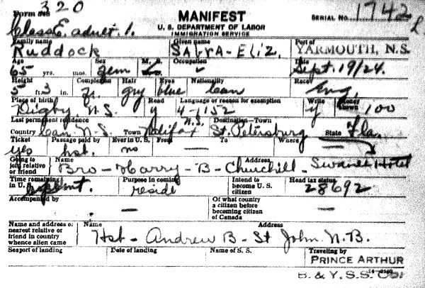 Parents Father: CHURCHILL, Joseph Henry Mother: TAYLOR, Frances Anne Birth Born on November 24, 1858 in Digby, Digby Co., NS Death Died on January 15, 1943 in Gulfport, Harrison Co., MS Buried in Saint Bartholomew Episcopal Cemetery in St. Petersburg, Pinellas Co., FL Marriages RUDDOCK, Andrew Block Married on May 18, 1881 in Digby, Digby Co., NS Sources Findagrave.com: https://www.findagrave.com/memorial/25670460/sabra-e-ruddock Images Sabra Churchill Birth Sabra (Churchill) Ruddock Sabra Churchill Marriage Sabra (Churchill) Ruddock Border Crossing