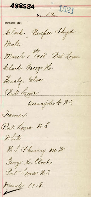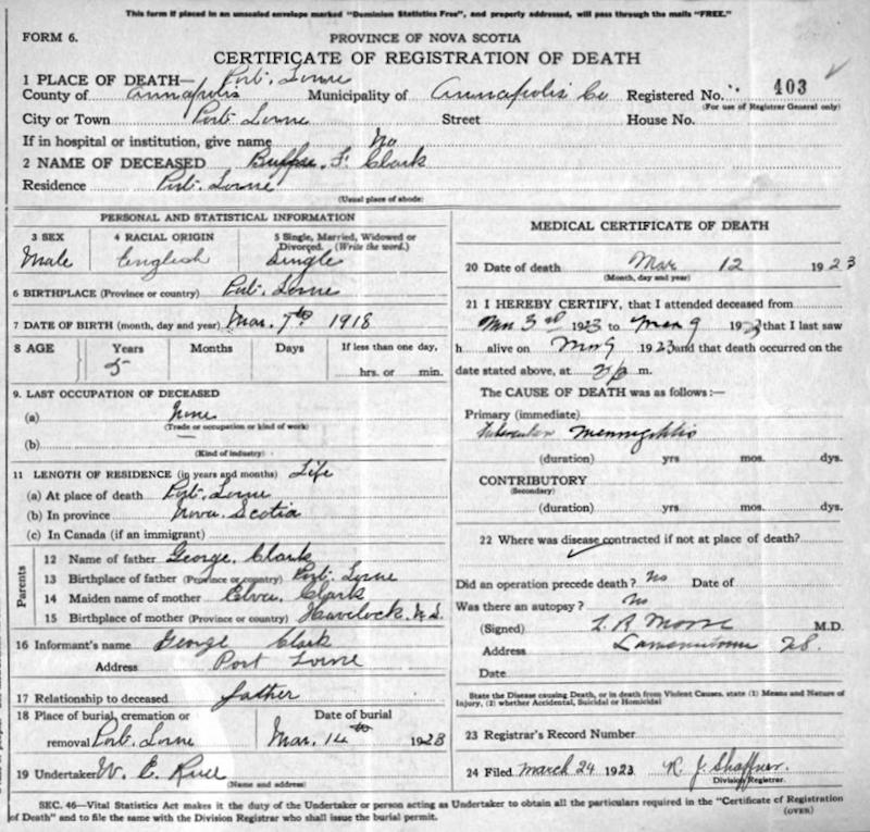 Parents Father: CLARK, George Herbert Mother: HEALY, Elva R. Birth Born on March 07, 1918 in Port Lorne, Annapolis Co., NS Death Died on March 12, 1923 in Port Lorne, Annapolis Co., NS Buried in Fundy View Cemetery in Port Lorne, Annapolis Co., NS Notes Death: Tuburcular Meningitis Sources Nova Scotia Deaths: Year 1923 File 53 #403 Images Burpee Clark Birth George & Elva (Healy) & Burpee Clark Burpee Clark Death