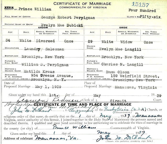 Birth Born on March 16, 1905 in Brooklyn, Kings Co., NY Death Died on 1966 in Brooklyn, Kings Co., NY Marriages LANGILL, Evelyn Mae Married on May 01, 1939 in Manassas, VA Children PERPIGNAN, Neal R.: July 15, 1940 PERPIGNAN, Curtis: 1942 PERPIGNAN, Carole: 1942 Notes Occupation: Laundry Salesman/ Ship Fitter Images Evelyn Langill Marriage