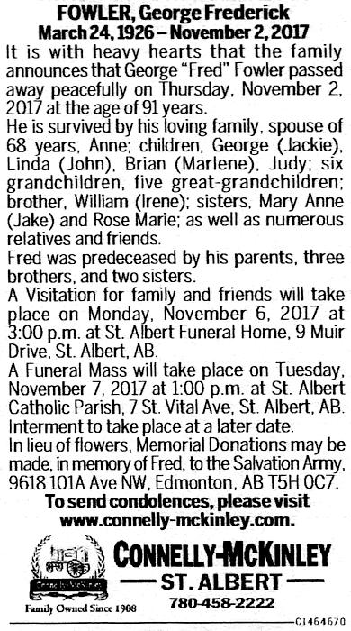 Parents Father: FOWLER, George Frederick Mother: GRAY, Adeline Alice (Kahandawes) Birth Born on March 24, 1926 in Ryley, Beaver Co., AB Death Died on November 02, 2017 in Edmonton Region, AB Buried in Saint Albert Roman Catholic Cemetery in Saint-Albert, Edmonton Region, AB Marriages MELNYCHYN, Anne Married on 1949 in Alberta, Canada Children FOWLER, George FOWLER, Linda FOWLER, Brian FOWLER, Judy Sources Newspaper Obituary: Edmonton Journal Edmonton,AB November 4,2017 Images George F. III & Anne (Melnychyn) Fowler George F. Fowler III Obit Edmonton Journal Edmonton,AB November 4,2017