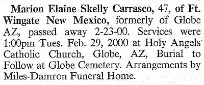 Parents Father: SKELLY, Bryan Jefferson Mother: LEWIS, Mary Helen Birth Born on February 03, 1953 in Santa Rita, Grant Co., NM Death Died on February 23, 2000 in Fort Wingate, McKinley Co., NM Buried in Globe Cemetery in Globe, Gila Co., AZ Marriages CARRASCO, Juan R. Sources Cemetery: Globe Cemetery Globe,AZ Images Marrion (Skelly) Carrasco Marrion (Skelly) Carrasco Obit