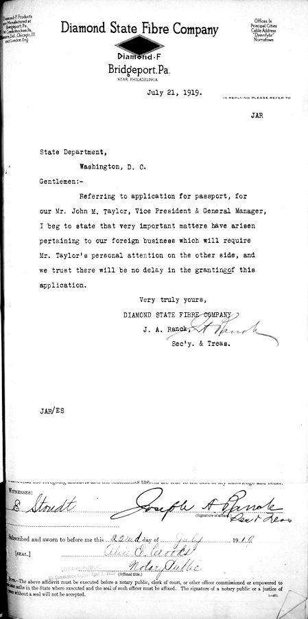 Birth Born on July 28, 1891 in Wilmington, New Castle Co., DE Death Died on 1959 Marriages PHINNEY, Ellis Married on November 17, 1915 in Medford, Middlesex Co., MA Children TAYLOR, Priscilla: October 04, 1916 TAYLOR, Ellis: 1919 TAYLOR, John Meily: May 02, 1921 TAYLOR, Diana: 1927 Notes Occupation: Diamon State Fibre Co. - Paper Manufacturer Vice President & General Manager Images Ellis Phinney Marriage John M. Taylor PassportA John M. Taylor PassportB John M. Taylor PassportC John M. Taylor Passport John M. Taylor