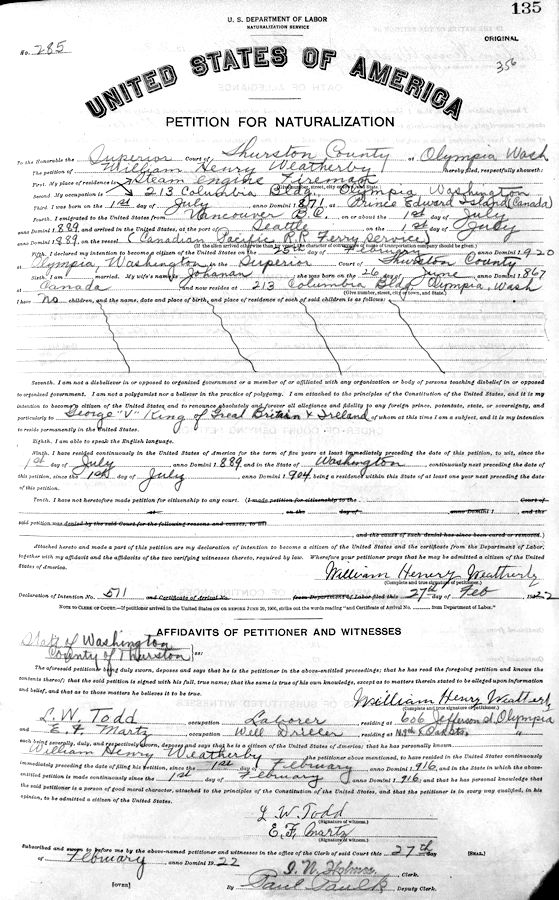 Parents Father: WEATHERBIE, William Henry Mother: BUCHANAN, Flora Birth Born on July 01, 1871 in Queens Co., PE Death Died on March 21, 1936 in Olympia, Thurston Co., WA Buried in Masonic Memorial Park in Tumwater, Thurston Co., WA Marriages CAMPBELL, Joann Notes Occupation: Fireman - Lumber Mill Boiler Death: Fell in sawdust bin and buried and suffocated. - Springer Mill Co. Sources Washington Deaths: Thurston Co. Olympia Record #50 #52 Images William H. Weatherby William H. Weatherby Death William H. Weatherby Naturalization1 William H. Weatherby Naturalization