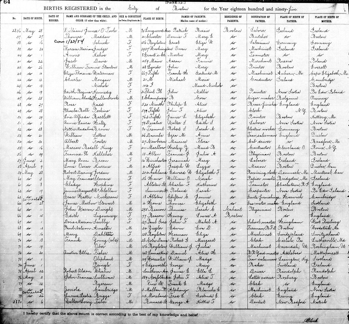 Parents Father: McLELLAN, Ronald Mother: WEATHERBIE, Sarah Ann Birth Born on May 19, 1895 in Boston, Suffolk Co., MA Death Died on April 13, 1942 in Manhattan, New York, NY Buried in Cypress Hills Cemetery in Brooklyn, Kings Co., NY Marriages BOUTILIER, George W. Married on June 05, 1911 in Dartmouth, Halifax Co., NS CHESNEY, John Notes Occupation: Laundress Sources New York City Deaths: #8086 Images Jennie McLellan Birth Jennie McLellan Marriage