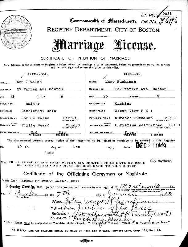 Parents Father: BUCHANAN, Murdock Archibald Mother: WEATHERBIE, Christina Ann Birth Born on 1894 in Oceanview, Queens Co., PE Marriages WALSH, John Joseph Married on January 07, 1920 in Boston, Suffolk Co., MA Children WALSH, John J.: 1924 WALSH, Edwin Francis: January 26, 1926 - December 27, 1978 WALSH, Robert V.: 1927 Notes Occupation: Cashier Images Mary Buchanan Marriage