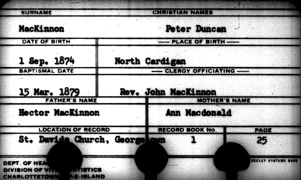Birth Born on September 01, 1874 in North Cardigan, Kings Co., PE Marriages McLEOD, Mary Jane Children MACKINNON, Pearle Evelyn: 1903 - 1999 MACKINNON, Catherine: May 13, 1906 MACKINNON, James Judson: October 19, 1907 - May 06, 1966 MACKINNON, Josephine: February 13, 1910 MACKINNON, Harold Ernest: September 19, 1911 - 1992 Images Peter MacKinnon PEI Baptism Record