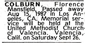 Parents Father: MYERS, Henry C. Mother: McPHEE, Catherine Birth Born on February 26, 1911 in Berlin, Coos Co., NH Death Died on August 15, 1987 in Los Angeles, Los Angeles Co., CA Marriages MANSFIELD, Walter Hays Married on May 29, 1937 in Nashua, Hillsborough Co., NH Notes Occupation: Nurse Images Florence Myers Marriage Florence (Myers) Colburn Obit