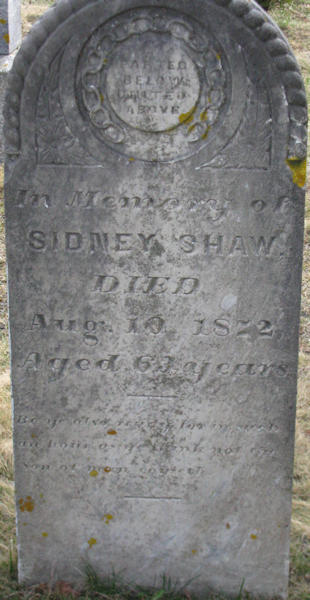 Parents Father: SHAW, David Mother: PHINNEY, Desiah Birth Born on November 08, 1808 in Phinney Mountain, Annapolis Co., NS Death Died on August 10, 1872 in Waterville, Kings Co., NS Buried in Berwick Cemetery in Berwick, Kings Co., NS Marriages SKINNER, Caroline Married on December 31, 1828 in Cornwallis, Kings Co., NS Children SHAW, Moses: January 16, 1830 - January 06, 1912 SHAW, Isaac: September 22, 1832 - February 25, 1900 SHAW, Mary Ann: January 05, 1835 - April 04, 1836 SHAW, David Albert: February 22, 1839 - June 29, 1915 SHAW, Orindia: 1841 - February 10, 1854 SHAW, Harriet: September 22, 1841 - November 10, 1902 SHAW, Alfred Skinner: August 08, 1844 - May 02, 1913 SHAW, Teressa Anna: 1847 - February 19, 1854 SHAW, Abbie Louisa: June 05, 1850 - March 27, 1926 Notes Occupation: Farmer Death: Burnt To Death Sources Nova Scotia Deaths: Book 1811 Pg. 89 #219 Images Sidney Shaw