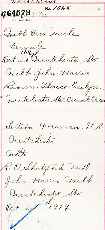 Birth Born on October 20, 1914 in Westchester Station, Cumberland Co., NS Death Died on July 09, 1965 in Halifax, Halifax Regional Municipality, NS Buried in St. Peter's Anglican Church Cemetery in Coburg, Northumberland Co., ON Marriages ROBERTS, Edgar Willigar Married on July 02, 1935 in Parrsboro, Cumberland Co., NS Children ROBERTS, Glenn: 1935 - 1958 Notes Occupation: Teacher/ Clerk Supervisor Civil Service Death: Cancer Sources Nova Scotia Deaths: Year 1965 #4247 Images Vera Webb Birth Vera (Webb) Roberts Death Edgar Roberts Marriage