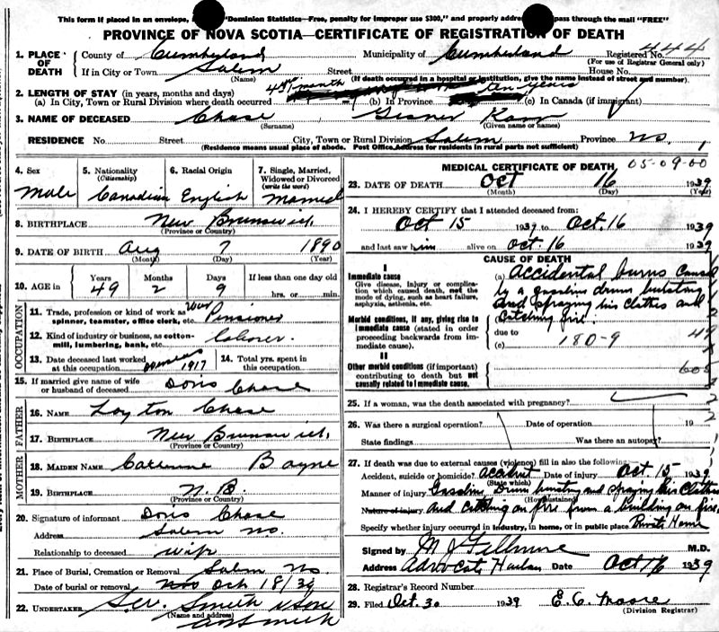 Birth Born on August 07, 1890 in Dorchester, Westmorland Co., NB Death Died on October 16, 1939 in Salem, Cumberland Co., NS Buried in Browns Cemetery in Salem, Cumberland Co., NS Marriages BROWN, Dora Kathleen Married on May 01, 1927 in Sackville, Westmorland Co., NB Children CHASE, Kenneth CHASE, Robert Percy BUGLEY, Carol (Chase) CHASE, Elsie CHASE, Isabell Frances: November 01, 1927 - March 26, 2011 CHASE, Arnold Harding: 1933 - 1992 Notes Occupation: Foundry Worker/ Labourer Death: Burns - A gas drum bursting and his clothes caught fire. Sources Nova Scotia Deaths: Year 1939 File 187 #444 Images Gessner Chase Gessner Chase Death Dora Brown Marriage