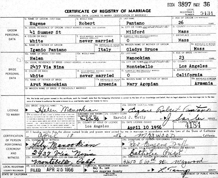Birth Born on January 02, 1933 in Montebello, Los Angeles Co., CA Death Died on 1968 in Massachusetts, USA Buried in Saint Marys Cemetery in Franklin, Norfolk Co., MA Marriages PANTANO, Eugene Robert Married on April 18, 1956 in Maywood, Los Angeles Co., CA Children PANTANO, Richard P.: January 25, 1957 PANTANO, Robert E.: October 01, 1960 Sources Massachusetts Cemeteries: Saint Marys Cemetery Franklin,MA Images Eugene & Helen (Manookian) Pantano Eugene Pantano Marriage Helen Manookian 1951